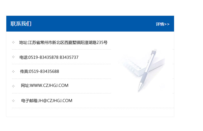 地址:常州市新北區(qū)友邦商務(wù)大廈1幢16、17層  電話:0519-85101652  傳真:0519-85112595  郵編:213022  網(wǎng)址:www.cz-jiayue_cn.hnycmj.com  郵箱:xiajifengaa@163.com